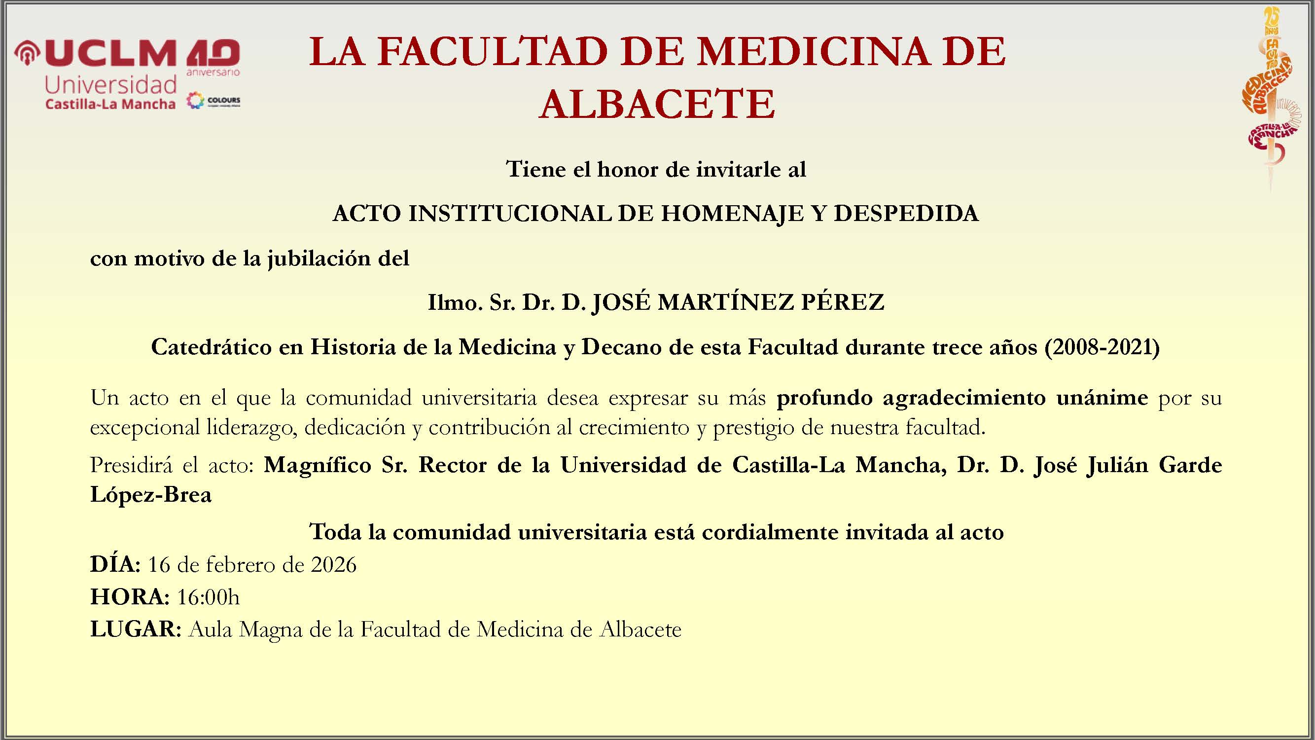 Con motivo de la Jubilación del que fuera Decano de esta Facultad durante dos legislaturas, se va a celebrar un Acto de Despedida el día 16 de febrero a las 16:00h en el Aula Magna de la Facultad de Medicina de Albacete.