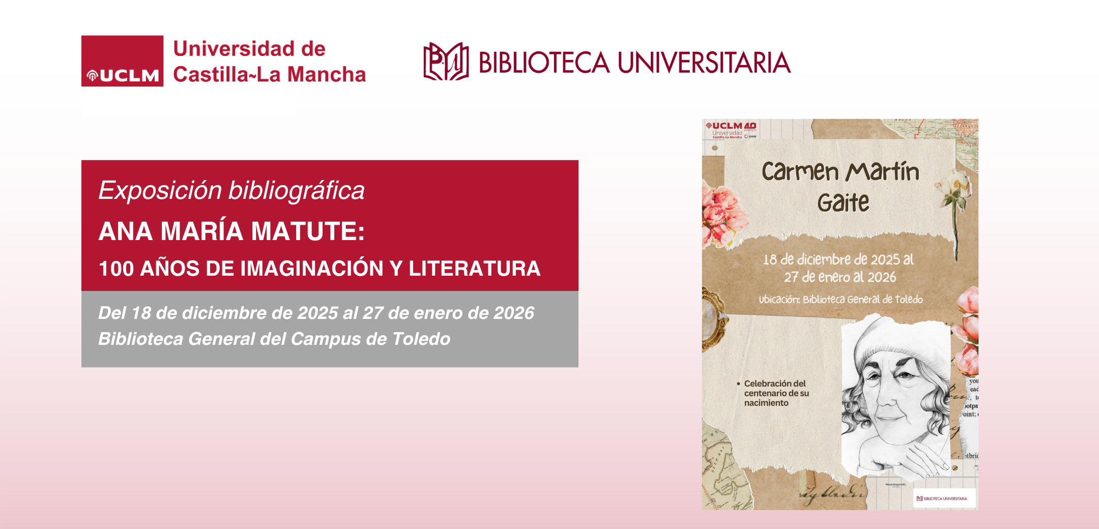 La Biblioteca General del Campus de Toledo conmemora el centenario del nacimiento de Carmen Martín Gaite con una exposición bibliográfica que podrá visitarse del 18 de diciembre de 2025 al 27 de enero de 2026.