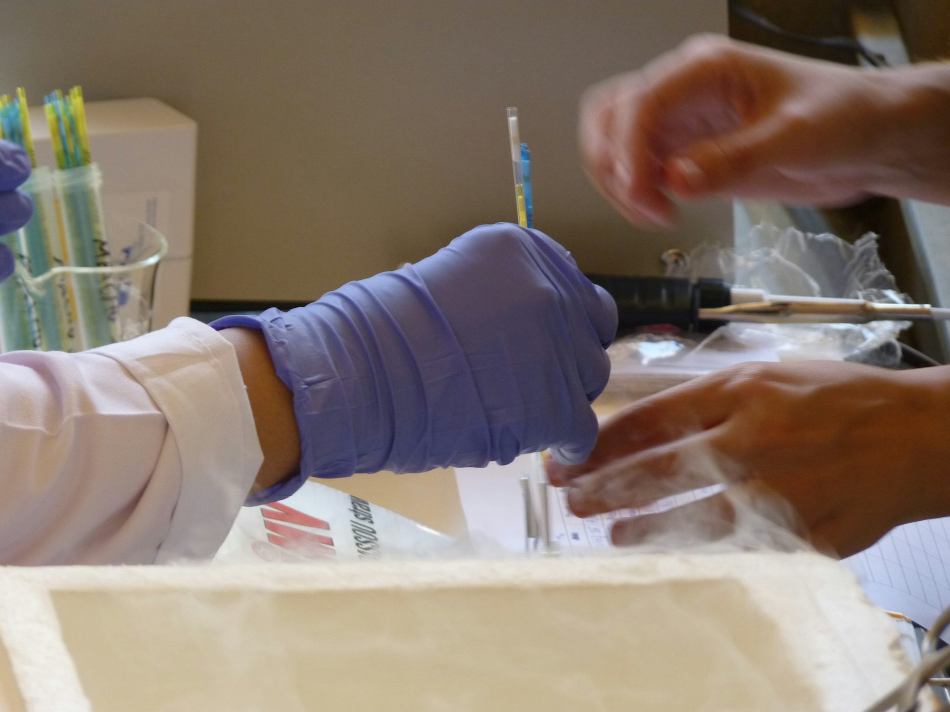 Personal introduciendo muestras en una caja con nitrógeno líquido.