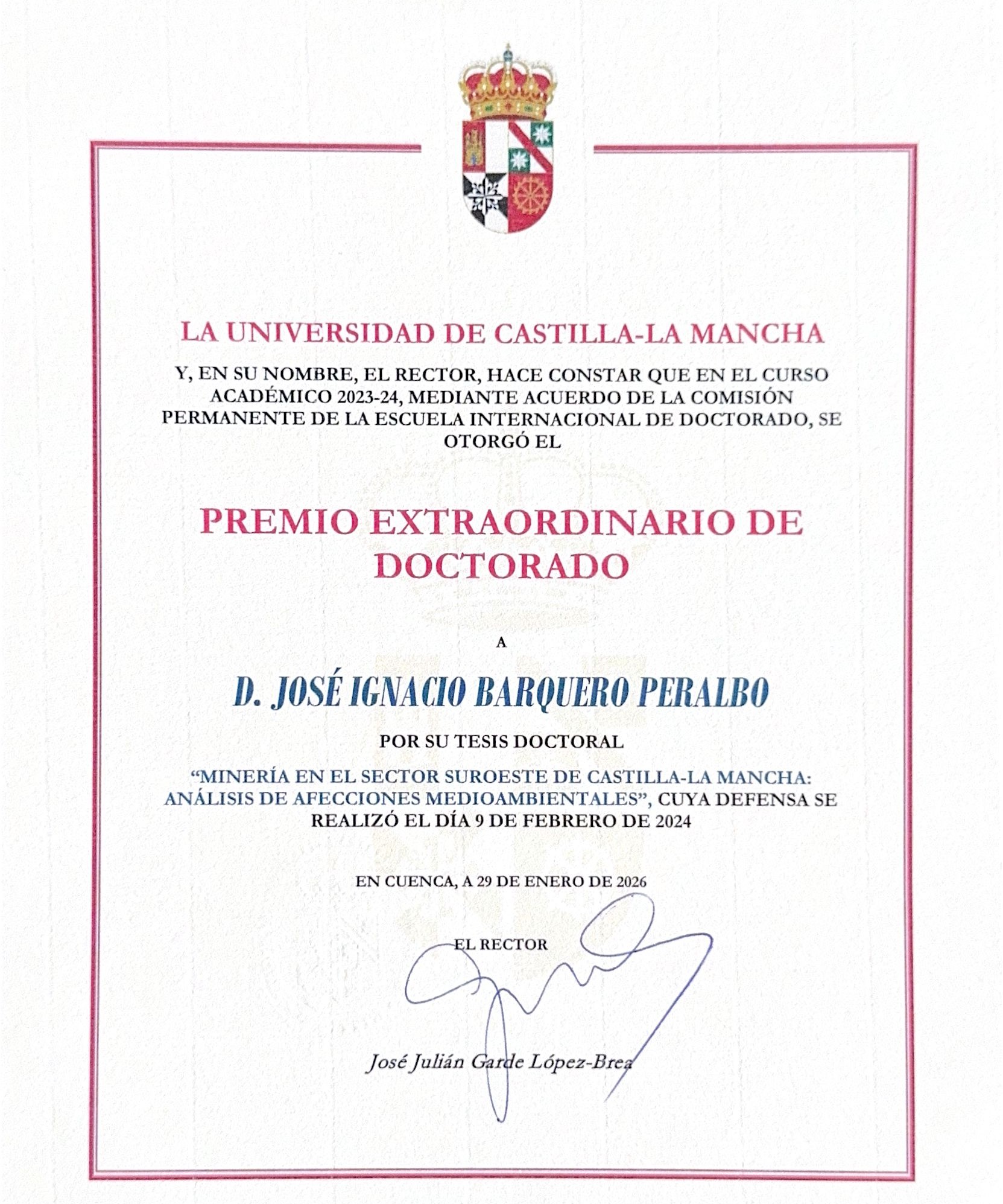 El Instituto de Geología Aplicada (IGeA-UCLM) felicita efusivamente a José Ignacio Barquero Peralbo por la obtención del Premio Extraordinario de Doctorado, un reconocimiento merecido a su rigurosa investigación sobre los impactos ambientales de la minería en el suroeste de Castilla-La Mancha; a María Mercedes Madrid Illescas por la exitosa defensa de su tesis doctoral, que profundiza en el impacto biogeoquímico de los elementos potencialmente tóxicos en suelos mineros; y al profesor Luis Mansilla Plaza por sus 40 años de dedicación ejemplar a la docencia, la investigación y la Universidad. Sus logros son un orgullo para toda la comunidad del IGeA y un ejemplo del compromiso con la excelencia científica y académica.