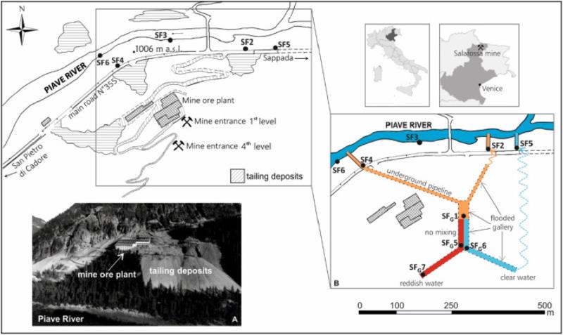 Mapa índice del área minera de Salafossa con la localización de los puntos de muestreo donde se recogieron las muestras de agua. A. Fotografía de los archivos de la Región del Véneto. B. Esquema de la galería inferior inundada donde tienen lugar los procesos de mezcla y dilución.